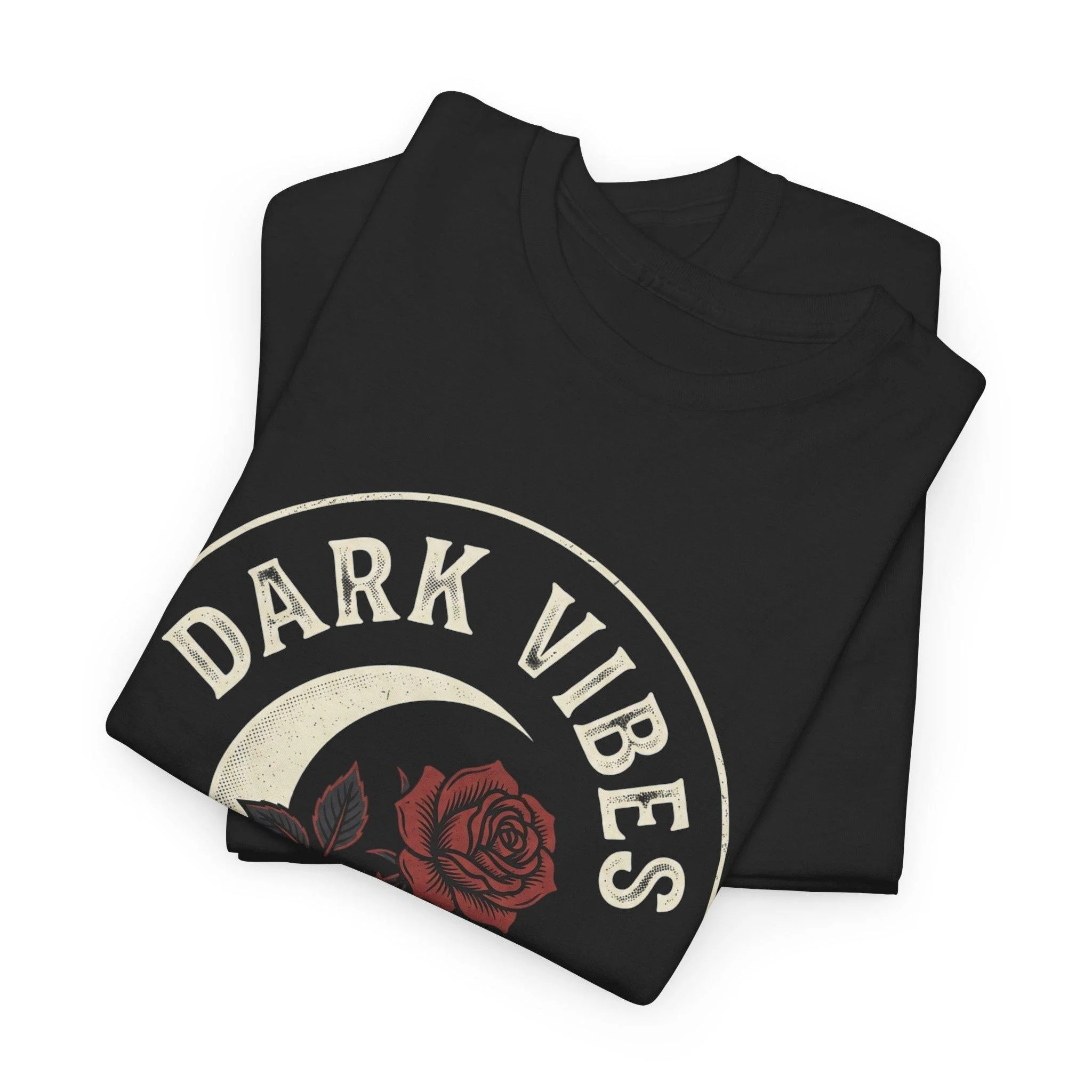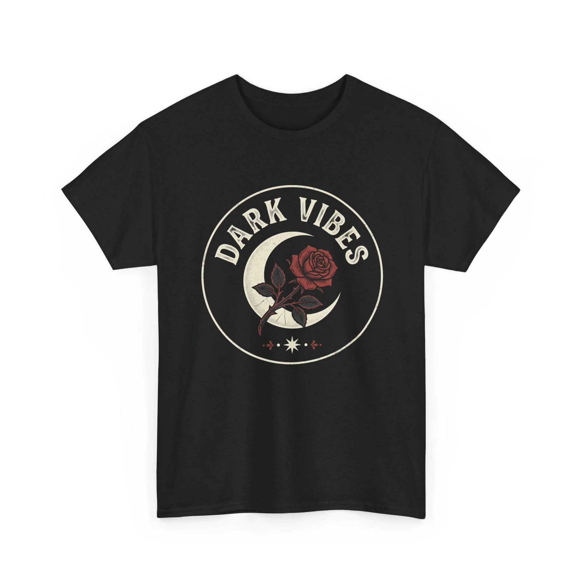 A short-sleeve tee with a moody, vintage-inspired graphic for those who lean toward darker aesthetics. The black shirt features a circular front print: a crescent moon, a deep red rose, and the words “DARK VIBES” in distressed lettering. The design reads like a quiet anthem — soft, slightly worn edges and earthy tones that feel lived-in rather than flashy. Wear it to late-night hangs, small shows, or when you want an everyday piece that quietly signals your taste for the melancholic and romantic.